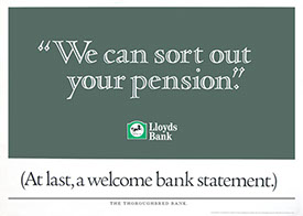 A one-off pension poster carried out for Lloyds Bank West Midlands Region through Colemore Row, Birmingham control. Simple but so effective with its instant impact and humour.